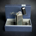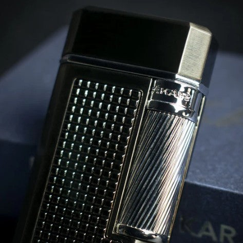 Encendedor metálico con diseño moderno y buen agarre. Encendido preciso con estilo sobrio.